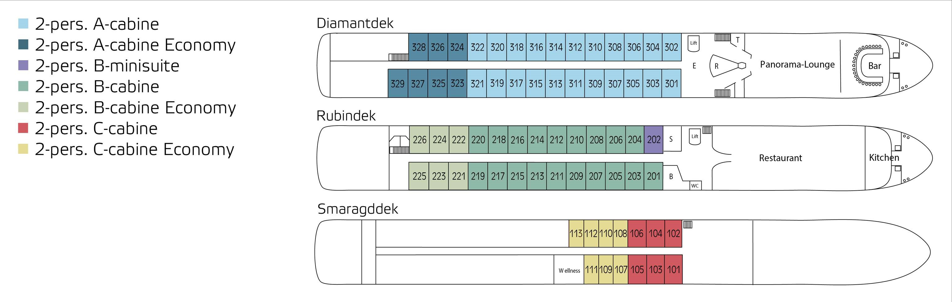 De cabines zijn verdeeld over drie dekken. Op het Diamantdek bevinden zich de A-cabines en de A-cabines Economy van 12 m². Alle A-cabines beschikken over een panorama schuifpui en een Frans balkon. Op het Rubindek bevinden zich de B-cabines van 13 m². Ook bevindt zich op het Rubindek één B-minisuite van 17 m². Op het Smaragddek vindt u de C-cabines van 12 m² met vensters die niet geopend kunnen worden. Daarnaast vindt u nog enkele 2/3-persoons C-cabines van ca. 13,5 m².